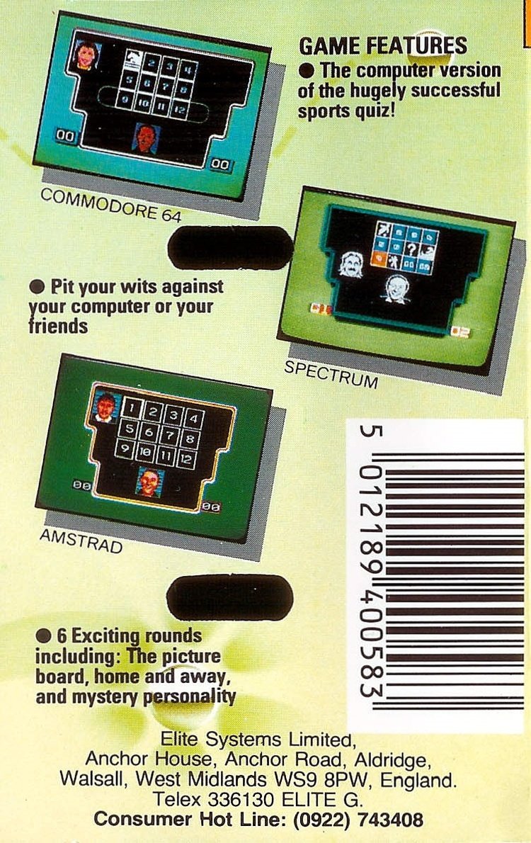 This is the game of the long running BBC quiz show of the same name. Two teams of three battle against each other by answering sports questions. 2 Points are awarded for answering your question correctly. If you answer incorrectly the opposing team get a chance to answer it but for only 1 point. There are 6 rounds including picture board, what happened next and a quickfire buzzers round. Contestants are displayed as digitized faces and each contestant specialises in a certain sport. Team captains get to choose which sport they wish to specialise in from a choice of ten. There are 5 question blocks so that if questions start to repeat you can load the next one to extend gameplay life. After the last round the scores are totted up and the winner is the team with the most points.
