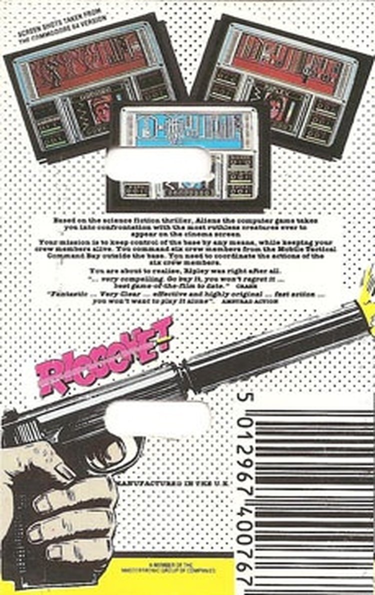 Based on the science fiction movie Aliens from 1986. After the contact got broken to the base on LV-426, Ripley and a group of soldiers make their way to this planet. While the Electric Dreams version of Aliens is a simple action game, this version features six mini games which are related to the movie.