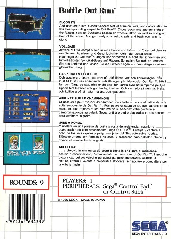 FLOOR IT! And accelerate into a coast-to-coast feat of stamina, wits and coordination in the heart-pounding sequel to Out Run. Chase down and capture eight of the fastest, nastiest Syndicate baddies on wheels. Strap yourself in and grab hold of the wheel. And get ready to smash, crash and bash your way to glory.