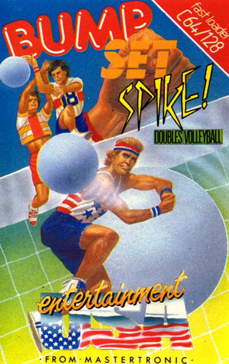 Bump, Set, Spike! Doubles Volleyball is a volleyball game for one or two players that features both indoor and beach courts. The player can choose to play alone against the computer, against another player or cooperate with another player against the computer. All modes involve two players per team and when not cooperating with a friend the player controls both players. When the ball is in play, a small x indicates where it will land and the player has to position himself with his arms aligned to it and then hold down the fire button to set the hardness of the hit. First hit is a bump, second is a set and third is a spike. To succeed with a spike the player has to be at the x spot and release the fire button just when the ball is about to land. While the ball is on the opposite side of the court the active player can be changed. The game can be played in nine difficulty levels divided into three sections: slow, medium and fast. Within each section are different rules for net fouls, ranging from being allowed to being penalised. is a volleyball game for one or two players that features both indoor and beach courts. The player can choose to play alone against the computer, against another player or cooperate with another player against the computer. All modes involve two players per team and when not cooperating with a friend the player controls both players. When the ball is in play, a small x indicates where it will land and the player has to position himself with his arms aligned to it and then hold down the fire button to set the hardness of the hit. First hit is a bump, second is a set and third is a spike. To succeed with a spike the player has to be at the x spot and release the fire button just when the ball is about to land. While the ball is on the opposite side of the court the active player can be changed. The game can be played in nine difficulty levels divided into three sections: slow, medium and fast. Within each section are different rules for net fouls, ranging from being allowed to being penalised.