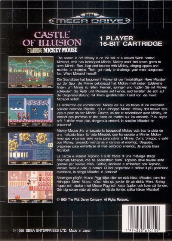 Mickey is on the trail of a wicked Witch named Mizrabel, who has kidnaped Minnie. Mickey must find seven gems hidden in the fantastic chambers and underground mazes of Mizrabel’s Castle of Illusion and use them to save Minnie.