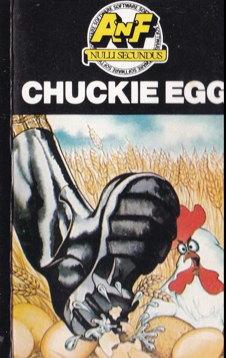 Chuckie Egg is an arcade game that was very popular in the UK, and was cross platform (initially to the Dragon 32, ZX Spectrum and BBC Micro. Later it was also ported to the Coco 1/2/3, Commodore 64, Acorn Electron, Atari 8 and 16 bit, Amiga, IBM PC, and several others). Controlled by the keyboard, you have run, jump and climb ladders in order to gather eggs (12 per level), as well as bonus for piles of seeds (which will get eaten by the hens if you don’t get to them first). You have to complete 8 levels of this, and then you go through the same 8 rounds again, with no hens… but the giant duck that you see trapped in the cage during your first 8 rounds is opened and he flies around trying to stop you. The game features some music, cool transitions, a top 10 score list with initials, and up to 4 players (taking turns).