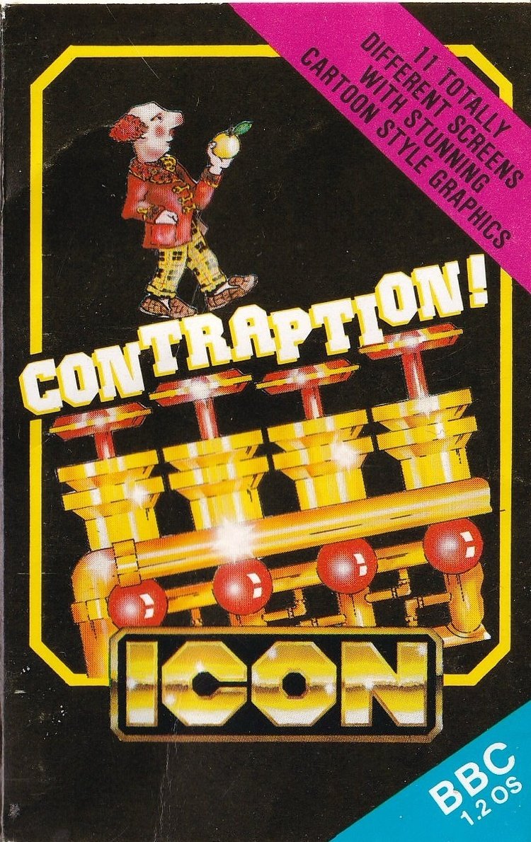 Contraption is a platform title where you control a crazy professor who is trying to collect golden apples to power his fabulous invention. It consists of ten single screen levels, each with its own distinct theme (under-water, frozen, hell, etc.) Every level contains four apples scattered about and guarded by a variety of enemies moving in regular patterns as well as some fixed dangerous objects. There are also moving platforms. The professor can die by touching something he shouldn’t, or by falling too far. Once all apples have been collected, a door opens. The professor needs to collect all apples and escape from the level before a timer runs out. Otherwise, the level resets and he has to start over.