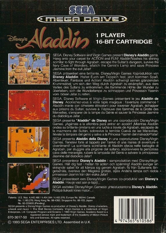SEGA presents a Disney/Virgin Games co-production of Disney’s Aladdin. Hang onto your carpet for ACTION and FUN! Aladdin slashes his shining scimitar to fight through Agrabah, escape the Sultan’s dungeon, survive the fiery Cave of Wonders, snatch the Genie’s Lamp and save Princess Jasmine from the evil Jafar!