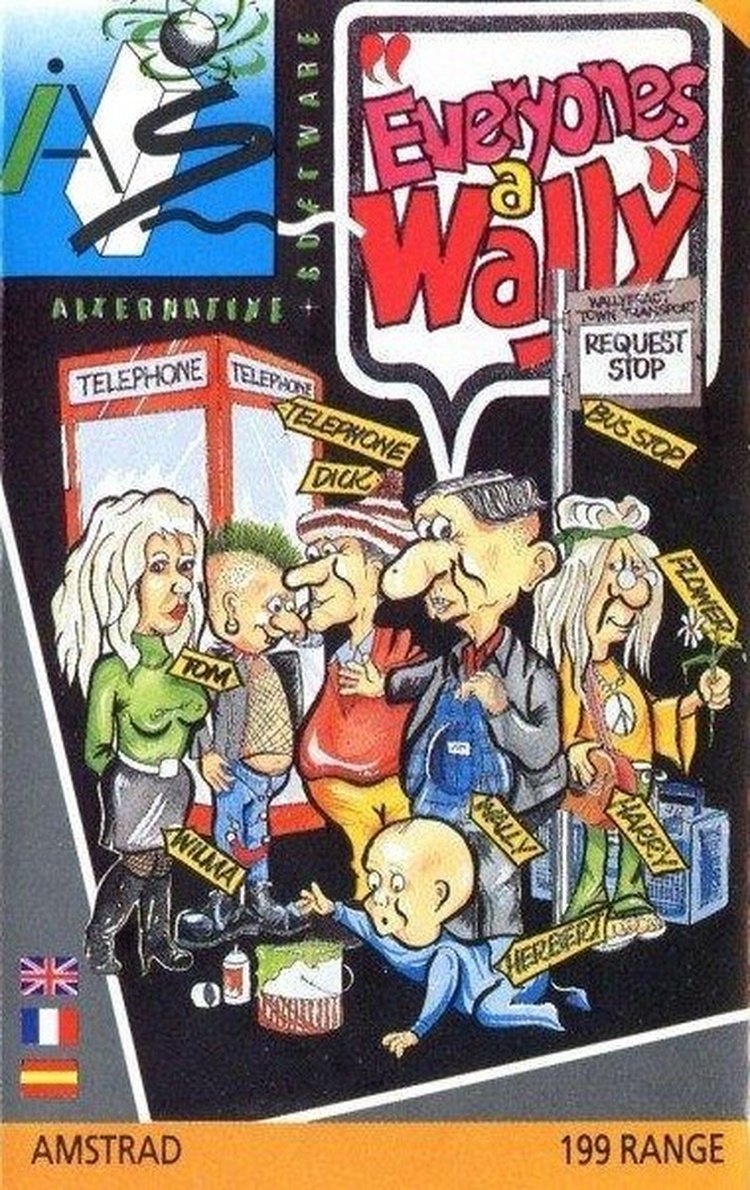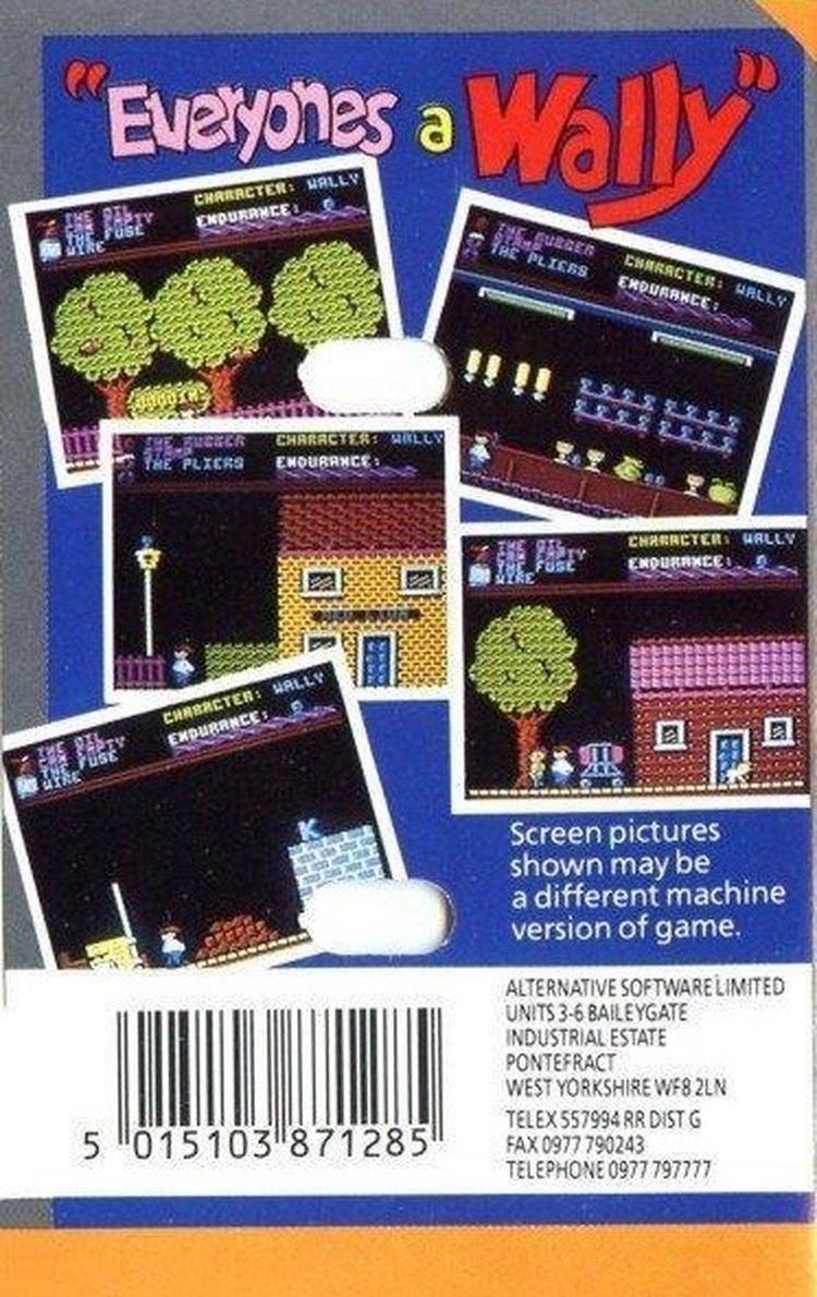 Everyone’s a Wally was the first arcade adventure game to feature multiple playable characters – a revolutionary feature at the time. Players began in control of Wally (a builder and handyman), but could switch to Wilma (his wife), and their friends Tom (a punk mechanic), Dick (a plumber) and Harry (a hippie electrician) – these last three names drawn from the placeholder phrase Tom, Dick and Harry. Herbert (their baby son) also appeared in the game as a mobile hazard NPC. The player cannot freely change character; the player begins in control of Wally and, in order to switch to another character, must first locate them. Characters not being controlled by the player wander randomly around the map controlled by extremely simple AI – another feature that, at the time, had never been seen before. Lives and health (called “endurance”) were tracked independently for each character, but the game ended if any character died. The aim of the game is to complete a day’s worth of work for each character; each character has a job to do stereotypical of their skill – for instance, Wally has to build a wall, Wilma has to take back three books to the library, etc. Completing the job awards the character with a letter, which spells out a password to open a safe holding everyone’s wages. (The eventual password is “BREAK” – knowing this does not spoil the game since most of the letters can be seen before jobs are complete; the game requires them to be actually collected before allowing the safe to open.)