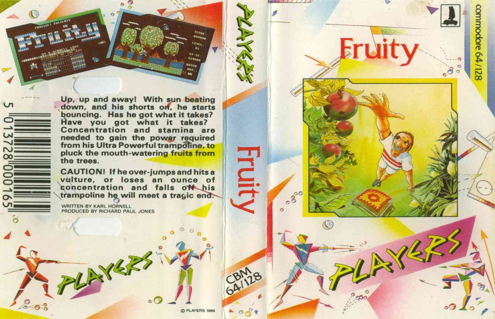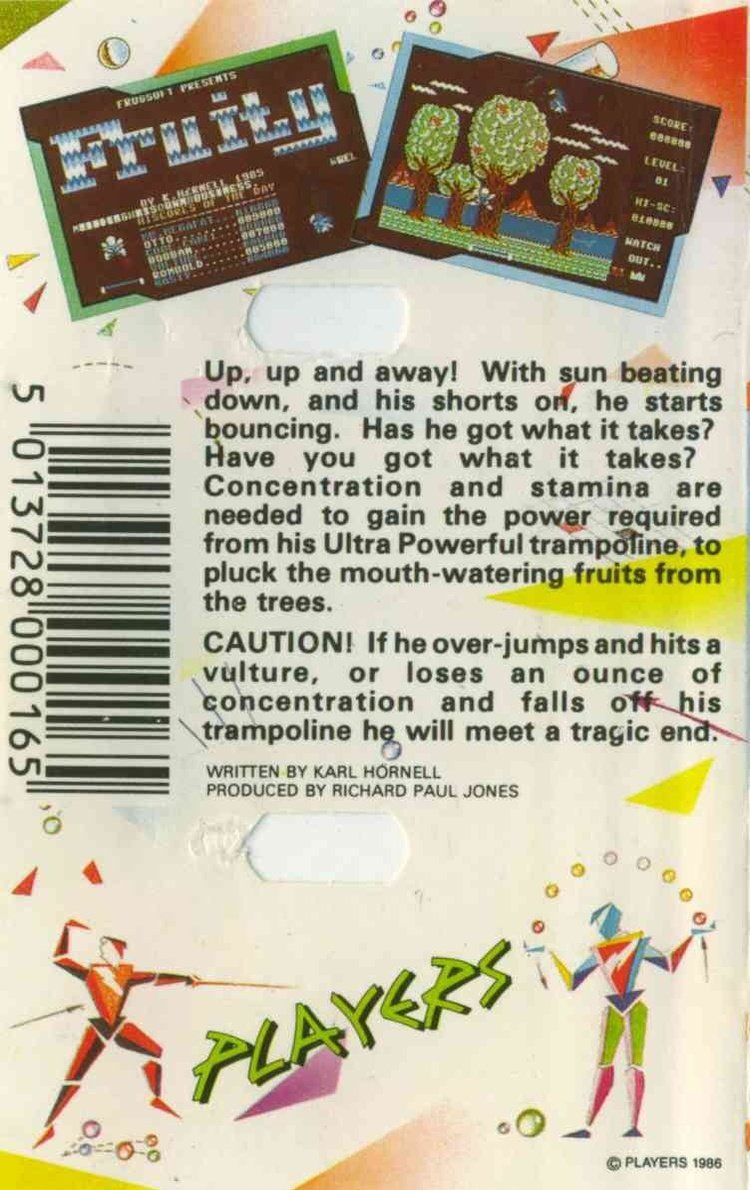 Fruity is a side view single screen game where you have to collect fruit from the trees using your ‘Ultra Powerful’ trampoline to reach the high parts of the trees to collect the fruit. You move the trampoline left or right on the bottom of the screen and you press fire to bounce higher. As you collect fruit a vulture flies across the top of the screen and sits sometimes in the top of one of the trees and if you hit it then you are carried away and a loss of one of four lives. If you hit the ground then you also lose a life.