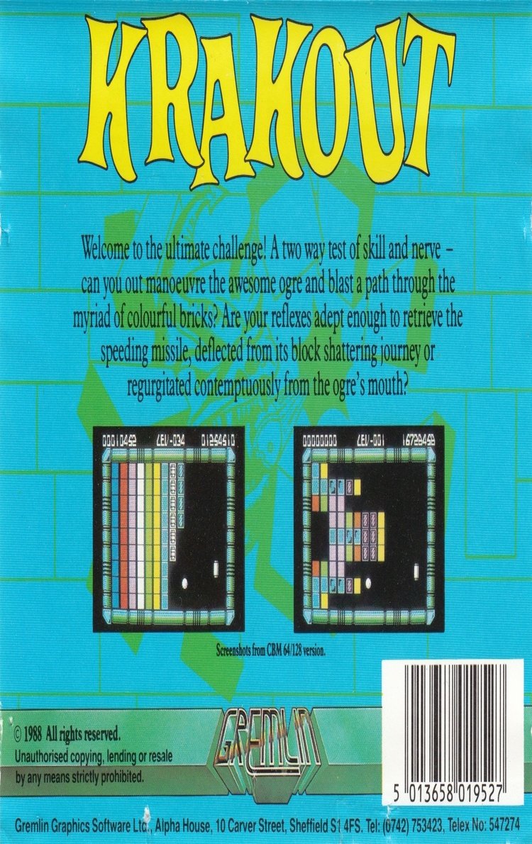 The BBC Micro conversion was programmed by John Mackay. Krakout was originally published by Gremlin and later re-released by Kixx.