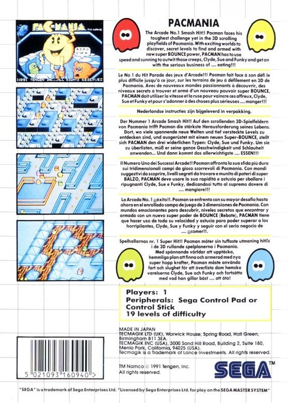 The game is presented in an oblique perspective with more detailed backgrounds than in previous Pac-Man arcade games. The disadvantage of this is that only a section of the play area is visible and therefore there is more of a reliance on scrolling. To counter this, Pac-Man now has the ability to jump, which can be used to avoid ghosts (apart from ghosts that can also jump). There are more ghosts on-screen than in previous titles too, who are found in a variety of different colors and are left unnamed. Unlike the original game there are now four maps, one of which is unlockable and each having their own music track.Though Pac-Mania was seen as a return to form for the Pac-Man franchise (previous entries such as Super Pac-Man, Pac & Pal and Pac Land had radically changed the original formula and were therefore not as successful), the game failed to receive the popularity obtained by the original Pac-Man or Ms. Pac-Man, mostly because despite appearing in 1987, it failed to offer much improvement over the original 1980 game.