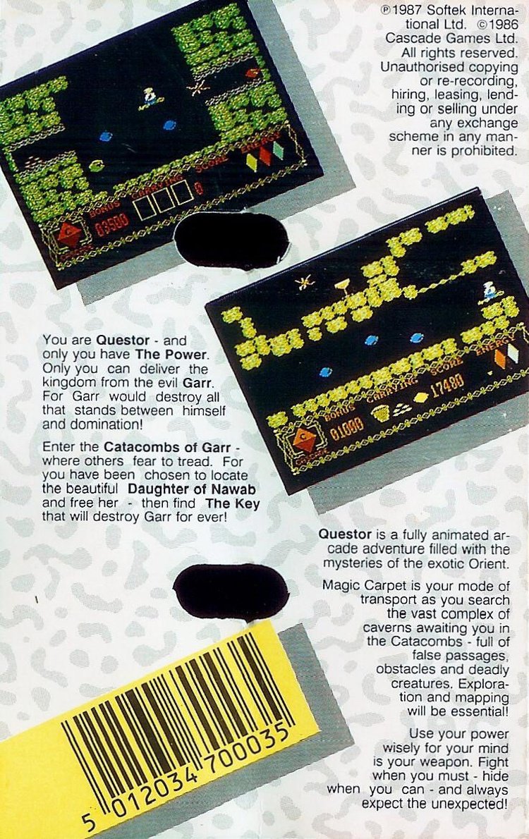 You are QUESTOR – and only you have The Power. The Power and the will to deliver your Kingdom from the evil Garr. For Garr would destroy all that stands between himself and domination. But you are strong with The Power. You can use The Power and enter where fear defeats the weak spirit. In the service of your master you must enter The Catacombs of Garr and face the dangers within. For it is your destiny that you have been chosen to locate the daughter of The Nawab and free her from the terrors of the darkness. Use your Power wisely for you mind is a weapon – fight when you must – hide when you can – but find The Key and Garr will be destroyed. A fully animated Arcade Adventure, Questor will test the mind as well as your reflexes. You are placed in a world which you must explore and map if you are to stand any chance of success. Locations are reproduced in stunning full colour graphics and new dangers are waiting around every corner. Expect the unexpected!