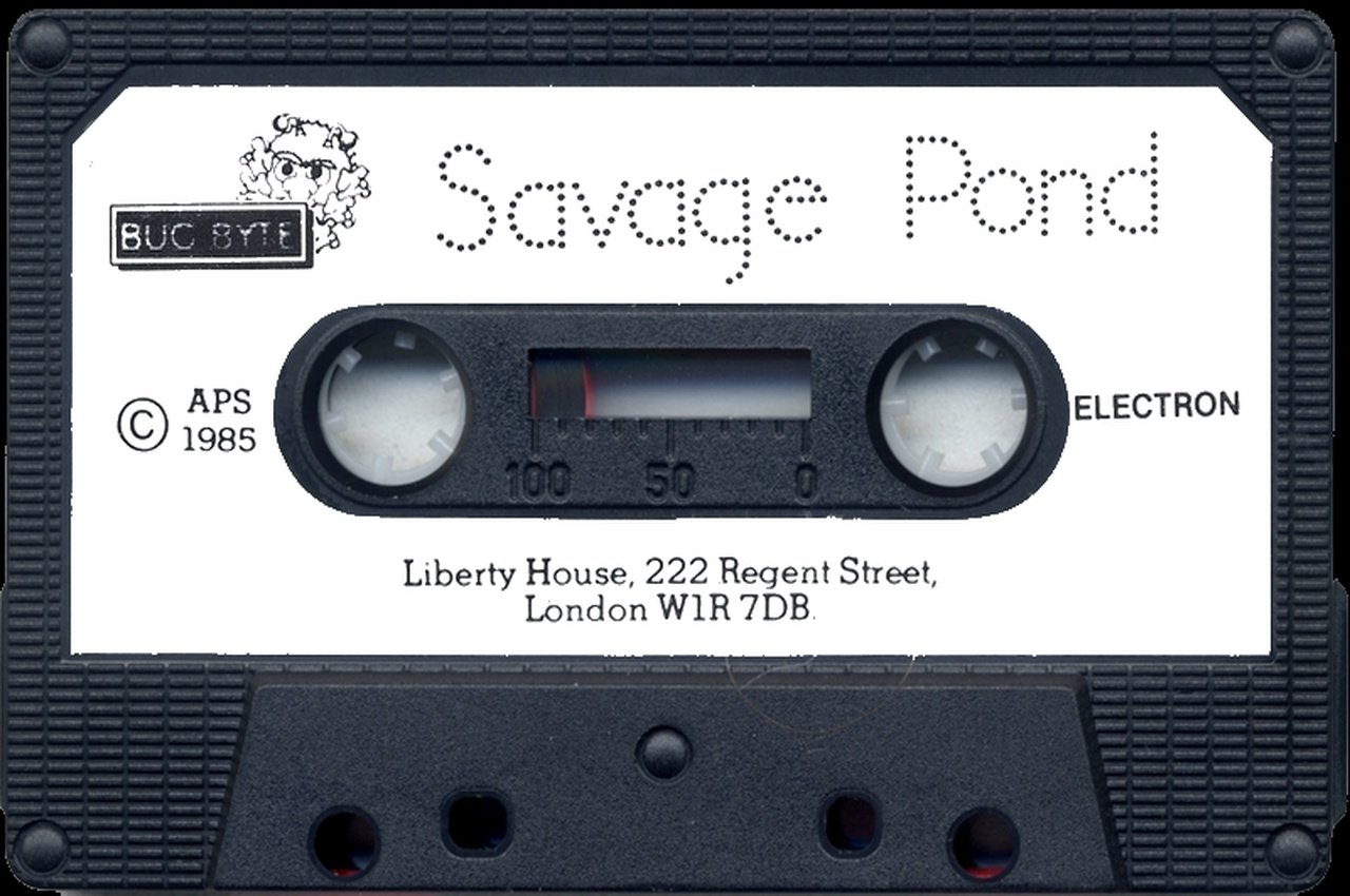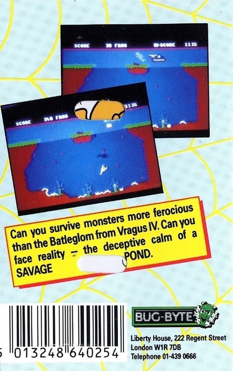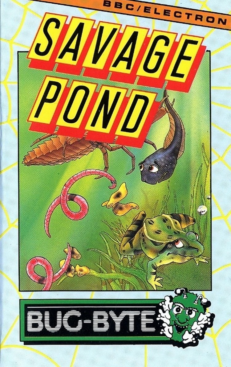 The goal for the player of Savage Pond is to build a colony of frogs. At the start, only a tadpole can be controlled, swimming in the depicted pond. It can eat amoeba, which increase the score, as well as worms which occasionally drop into the water. Eating five worms adds to a counter that, once it reaches 5, makes a beetle larvae appear. Eating it before the worm counter resets advances the game.