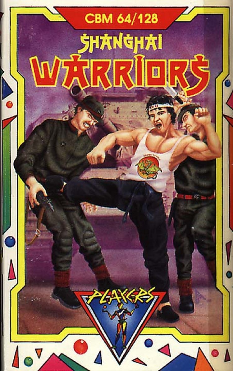 Shanghai Warriors is a side-scrolling fighting game featuring three levels: an airport, a military base, and a harbor. The main character can jump, punch, and kick, just like the enemies. While the kick has a slightly longer range, the punch is a little faster. To gain an advantage over the enemies, it is possible to pick up various weapons including a machine-gun, throwing knives, or shurikens. Ammunition for all weapons is limited. Unlike many similar fighting games, there are no end-of-level bosses in the game.