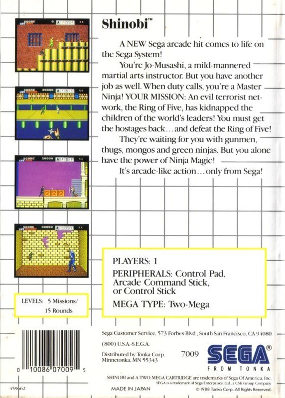 The game that started the franchise and launched Shinobi into fame, the original Shinobi is still considered a classic game of the arcade era. Released in 1987, it was ported to the NES Commodore 64 & Sega Master System. Shinobi introduced several novelties to traditional platform mechanics, such as sophisticated enemy AI and multiple layers in each level