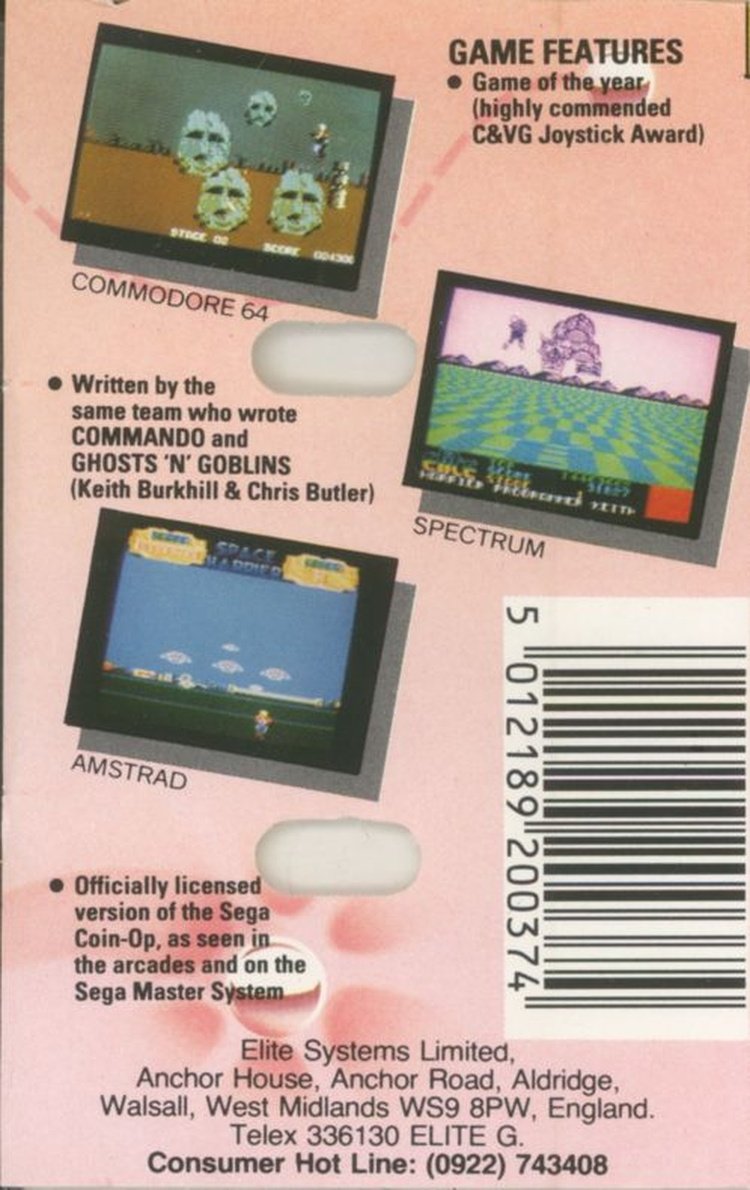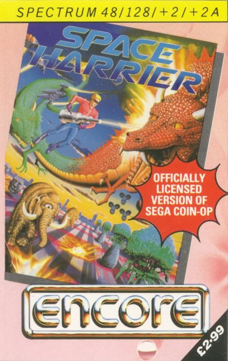Originating in the arcades, Space Harrier is a third-person rail shooter with pseudo-3D graphics, set in the same world as the Fantasy Zone series. The lone titular hero fights aliens with a fireball-launching cannon, which can also be used to transform the hero into a flying rocket. The protagonist is constantly in motion, but the speed of his movement can be regulated by the player.
