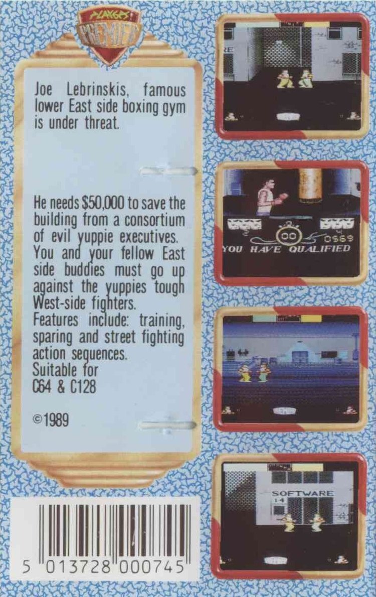 Any boxer that qualified but lost in the sparring exercise can still fight so it’s onto the streets to face six of the yuppie’s goons. The screen is viewed from the side with the screen scrolling from left to right as your boxer moves. As with the sparring both fighters have an energy bar and hitting decreases it. Defeat a goon and you walk to the right to face the next one. Lose all your boxers remaining and it’ s game over, defeat six goons and you have saved the gym.