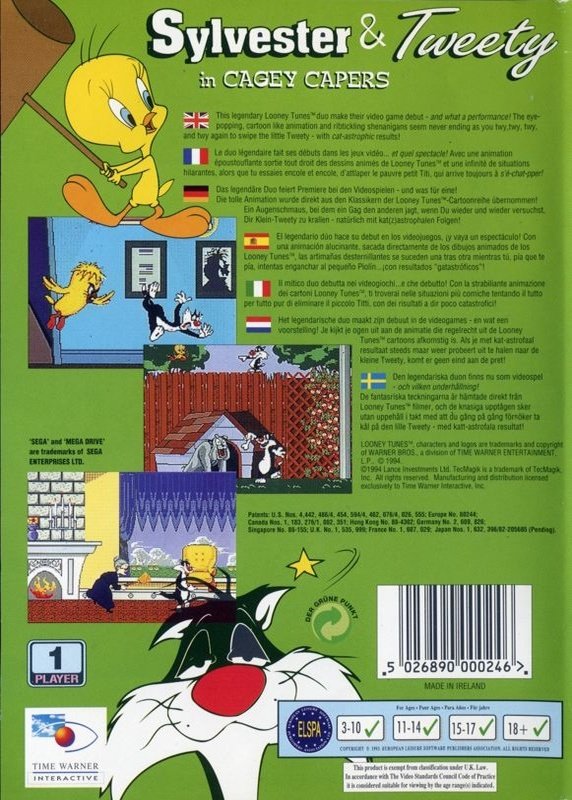 The ‘toon that plays like a game, Sylvester and Tweety in Cagey Capers brings the voices, animation and backgrounds of the Warner Bros. original TV cartoon series to the Sega Megadrive.