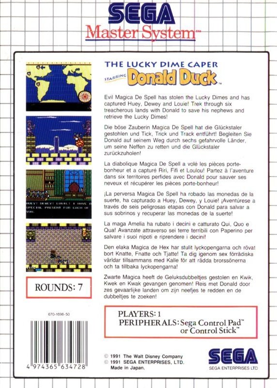 The Lucky Dime Caper starring Donald Duck is a platform game released for Sega Master System and Sega Game Gear in 1991. It is the 8-bit counterpart to Quackshot (a Sega Mega Drive/Genesis-only release), another Disney-licensed game which also features Donald Duck as the main character. A sequel to this game, Deep Duck Trouble, also featuring Donald Duck, was released for both consoles in 1993.