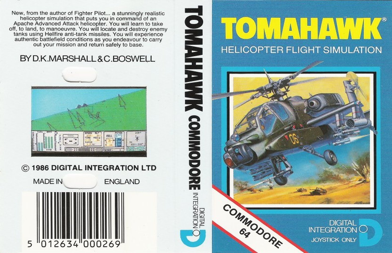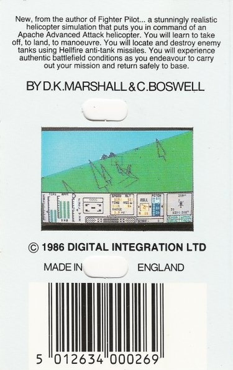 Flight simulation specialists Digital Integration turned their attention to helicopter flight in this recreation of the AH-64 Apache. All the controls are realistically simulated, so the airspeed is dependent on the height of the vehicle, and you can move horizontally using the rudder option as well as rolling left and right. If using a Sinclair joystick interface you can use both ports to have all these controls accessible on dual joysticks, just like the real thing. Either way, a full instrument panel allows monitoring of these.