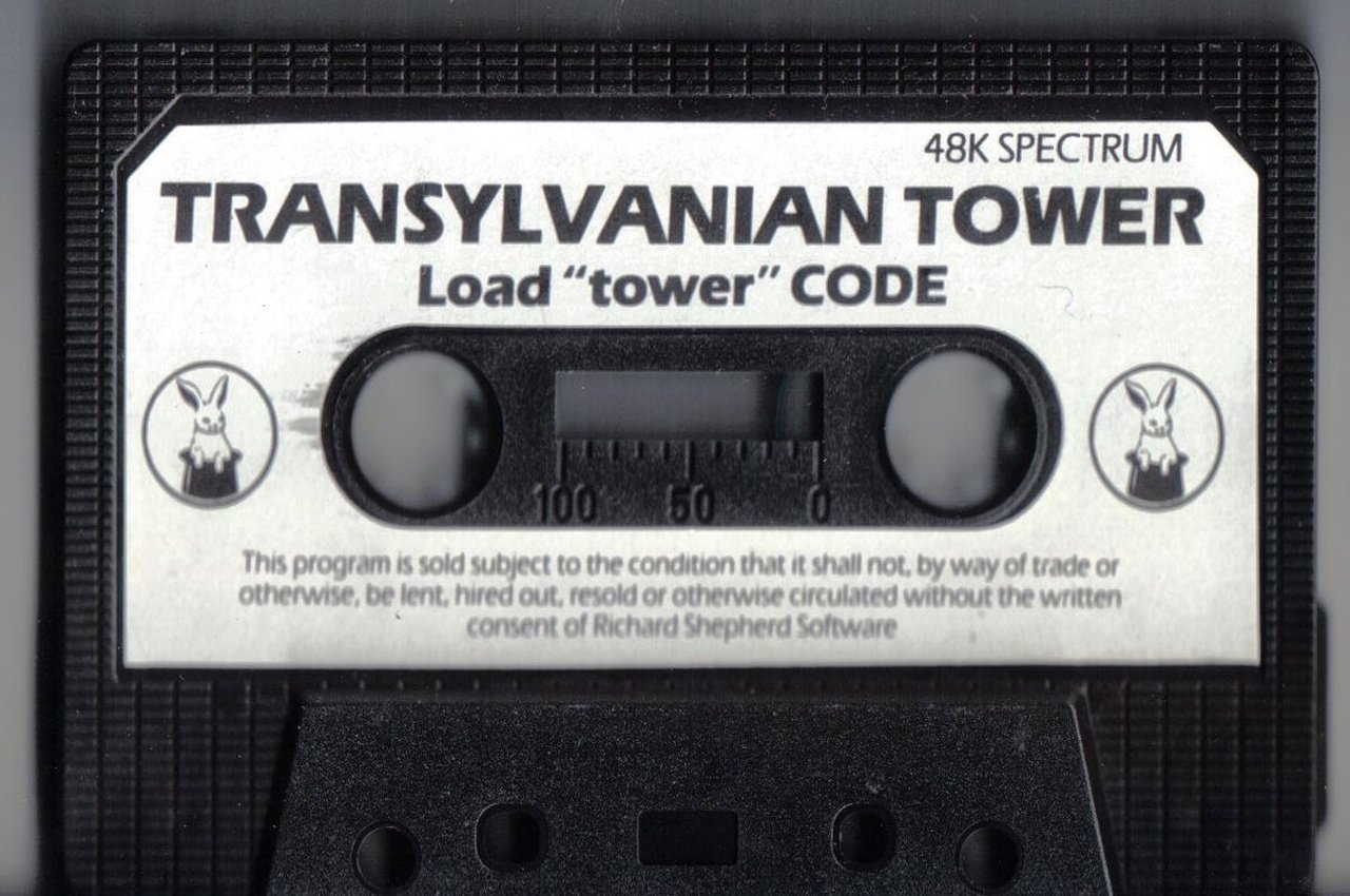 Transylvanian Tower is a single player maze game in which the player must explore five levels of Count Kreepie’s castle, kill him, and find his stash of loot. The castle has over five hundred different rooms to explore. Some contain items that can be used but the inventory is limited to only three items at any one time, and this includes weapons, so it’s wise to collect just what’s important. The items/weapons available are: the golden ring, an invisible cloak, a magic apple, a special floor plan, a clove of garlic, a mirror, a knife, a dagger, a sword, a silver cross and your gun – which is limited to 10 shots. If the player is killed at any time on level 2 and beyond, the game is over and they are returned to the start of level one.