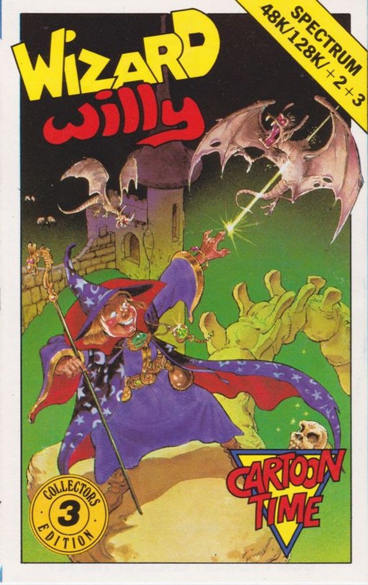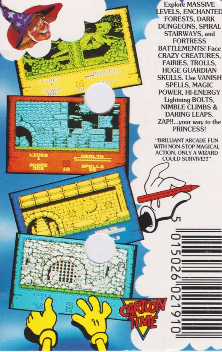 Wizard Willy is an action game with platform elements. Willy can fire lightning bolts at the many enemies who intervene. The enemies are dangerous to touch, but don’t fire back until later levels. Four icons are available to collect. One kills all monsters in the area, another gives an extra life, the third restores Willy to full strength at his current life, and the last restocks his lightning bolts. The levels incorporate forests (which include climbable trees), dungeons, stairways and fortresses.