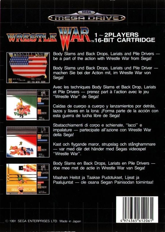 Wrestle War puts the player in the role of a rookie pro-wrestler, Bruce Blade, who has to go through a series of bouts to win the championship. The “Sega Wrestling Alliance” wrestling promotion in which the wrestlers compete is fictional. There are no real-life wrestlers or any licensed tournament used in the game; however, many of the characters bear a strong resemblance to popular wrestlers or movie characters.